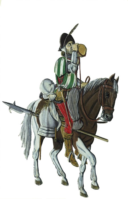 brigandine and plate arm defences. He has no defences for his legs shown,